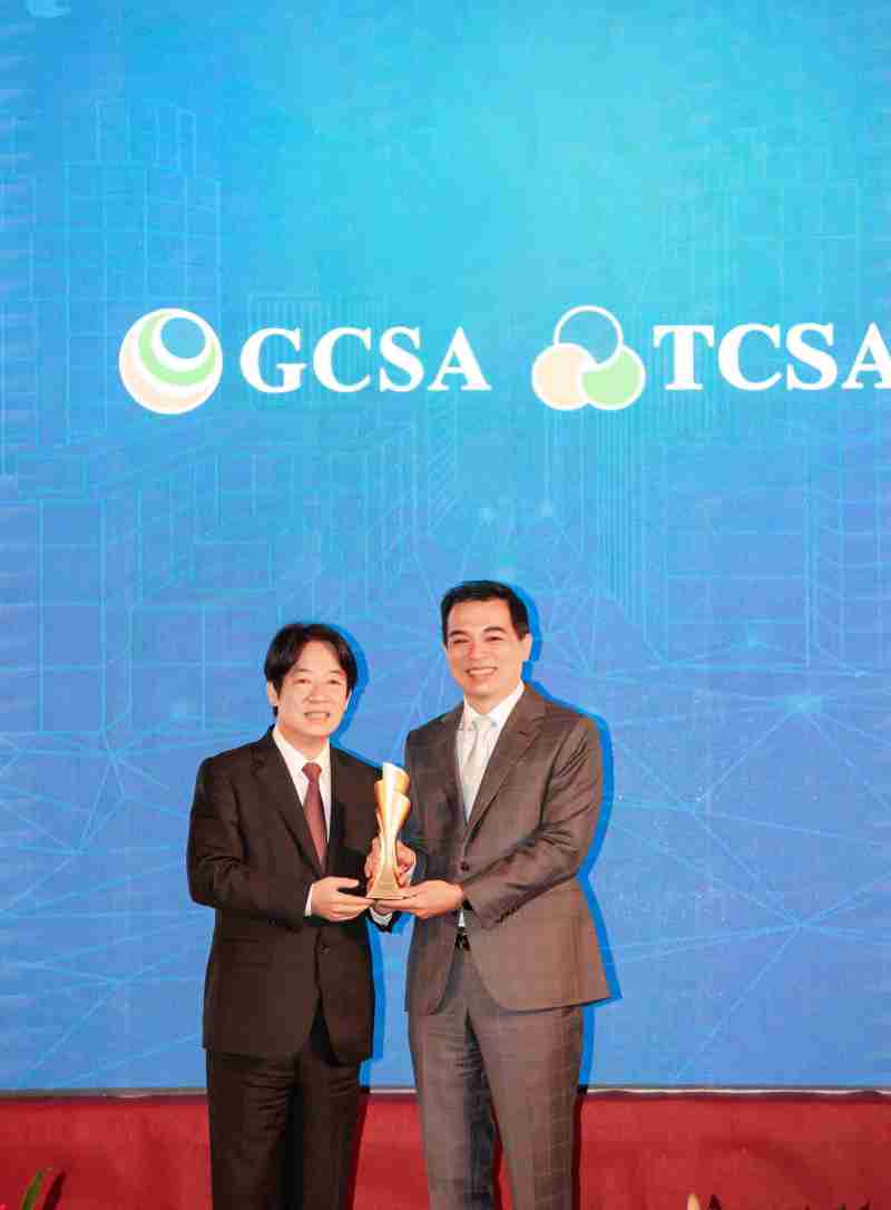 达全方位永续表现获全球永续奖及台湾永续奖肯定,,,由副总统赖清德颁奖 (左),,,,龙门国际总经理柯富仁 (右) 代表领奖