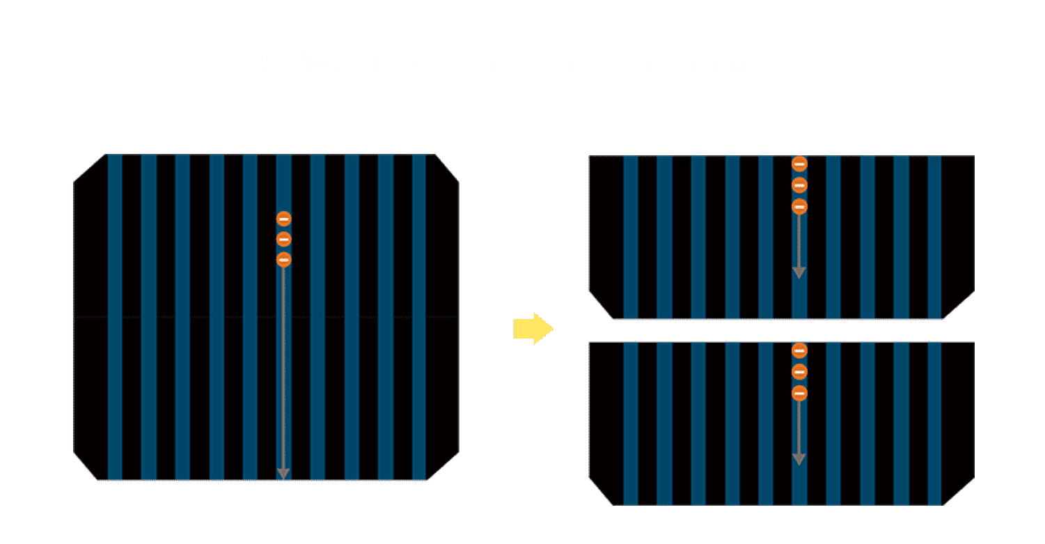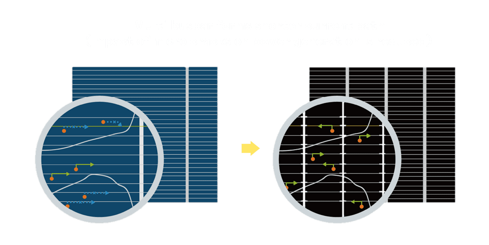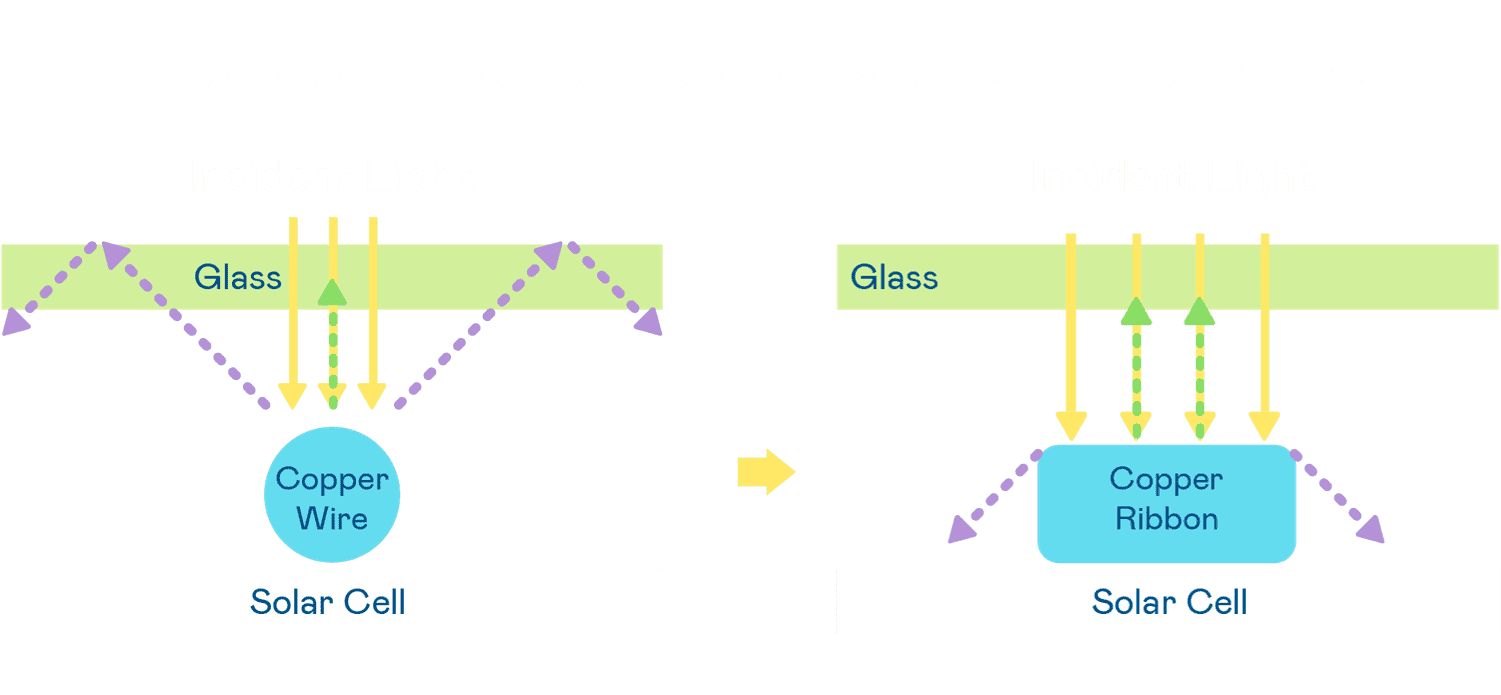 • 电池使用多条铜导线 (Copper wire) 于电池片上形成较短的电流路径,,,提高电流收集效率,,采用圆形设计的铜导线较传统扁平式的铜焊带 (Ribbon),,,可增加入射至电池的光线量。。。